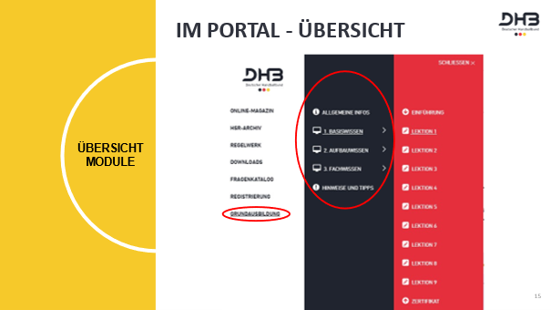 Das Portal ermöglicht den angehenden Neulingen eine flexiblere Ausbildung, da die Lerneinheiten in Module aufgeteilt sind und die Regeln im Selbststudium erarbeitet werden. Zwischen den Modulen findet stets eine Lernkontrolle mit allen Teilnehmern und einem Lehrwart aus dem Bezirk statt, welche dann zeiteffizient genutzt werden kann. Ein weiterer Vorteil ist, dass die Lernkontrollen auch virtuell stattfinden können, sollte es die Situation erfordern.