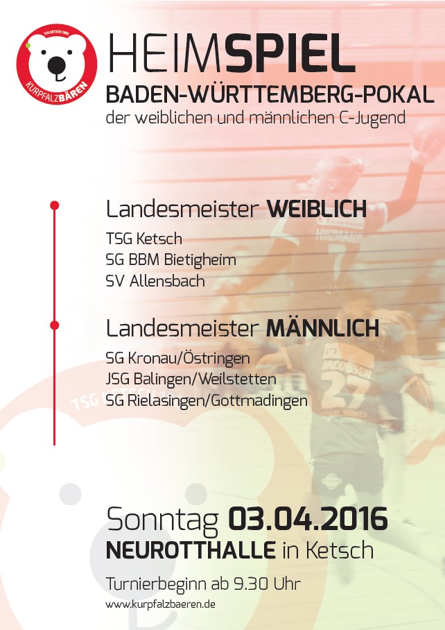 Am 03. April findet in der Ketscher Neurotthalle der Baden-Württemberg-Pokal der weiblichen und männlichen C-Jugend statt. Hierbei treten die jeweiligen Landesmeister aus Baden, Südbaden und Württemberg gegeneinander an, um die beste C-Jugend-Mannschaft aus Baden-Württemberg auszuspielen. Bei den Mädchen spielen die TSG Ketsch, die SG BBM Bietigheim sowie der SV Allensbach gegeneinander an, während bei den Jungs die SG Kronau/Östringen, die JSG Balingen/Weilstetten und die SG Rielasingen/Gottmadingen den BW-Pokal ausspielen.