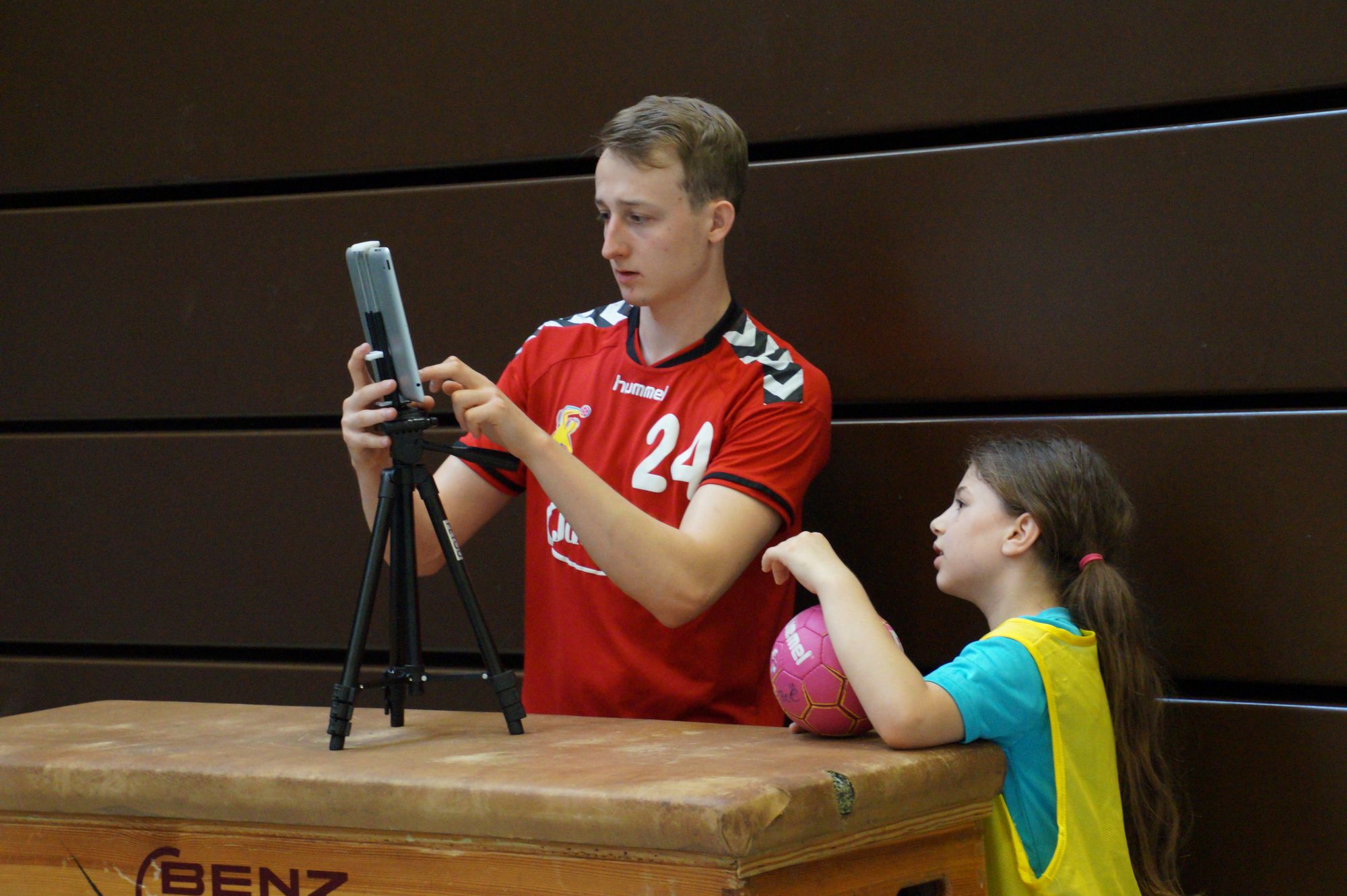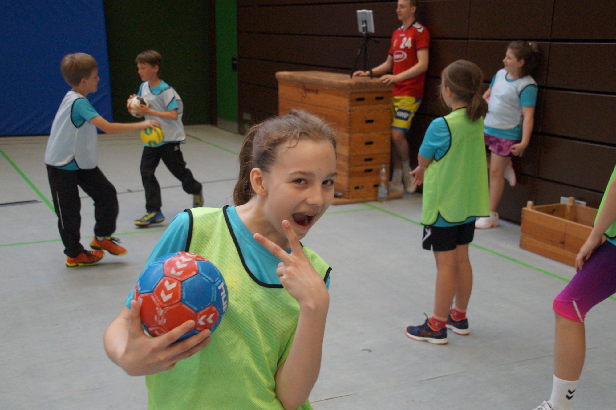Die tägliche Mittagspause war immer ein Highlight, denn nach einem leckeren und warmen Essen, gab es reichlich Obst und natürlich einen kleinen Snack. Gestärkt ging es dann in den zweiten Teil, des ersten Tages. Technik und Grundlagentraining waren an der Reihe. Die Teilnehmer/innen wurden in drei kleinere Gruppen eingeteilt und bekamen an drei Stationen verschiedene und neue Einblicke in die Technik und in das Grundlagenwissen im Handball. Am zweiten Tag gab es eine Einheit zum Teambuilding. Die Kinder sollten zum einen lernen, sich auf den Partner zu verlassen und zum anderen sollten sie bei vielen Übungen als Team zusammenarbeiten. Die Übungen hatten die Gruppe noch einmal mehr als eine Einheit zusammengeführt. Nachmittags, bevor es wieder mehr an die handballerischen Übungen ging, stand die Auslosung der Teams, für das Handballturnier auf dem Plan. Nachdem sich die Teams zusammengefunden und sich kreative Teamnamen überlegt hatten, standen Individualtaktik, Kooperation in der Kleingruppe und Koordinations-Übungen auf dem Plan. Mittwochmorgens gab es die Vorrundenspiele des Handballturniers, insgesamt wurden 12 Spiele der sechs Teams durchgeführt. Währenddessen gab es immer für eine Mannschaft eine genaue Videoanalyse des Wurfarmes. Die aufschlussreichen Tipps wurden direkt im darauffolgenden Spiel tatkräftig umgesetzt. Nach viel Aufregung gab es mittags ein wenig Auflockerung. Eine Gruppe durfte im Ringerraum ihre Kräfte spielen lassen, die zweite Gruppe hatte Spaß bei Ballkoordination und die dritte Gruppe gab alles bei einem Staffelspiel.