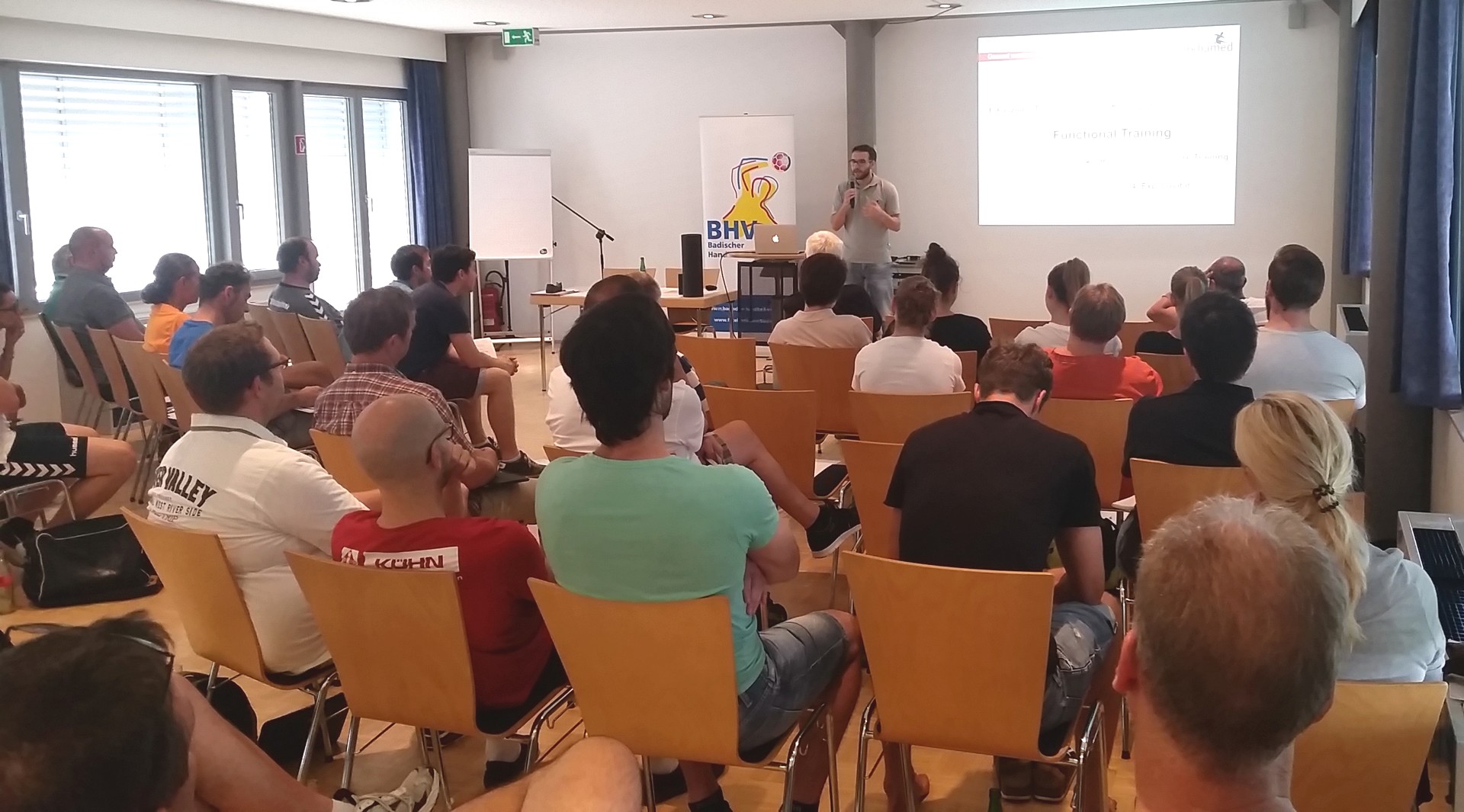 Am Samstag den 22.07.2017 bot der BHV in Kooperation mit den ARCUS Kliniken Pforzheim als BHV-Partner in Karlsruhe im Haus des Sports eine Fortbildung zum Thema der präventiven Maßnahmen im Handball an. Geleitet wurde die Fortbildung vom ärztlichen Direktor der ARCUS Kliniken Dr. Thomas Ambacher, der zu weiteren Spezialgebieten Matthias Kraus (Physiotherapeut, Rehamed Pforzheim) sowie Nils Petersen (Orthopädietechnik-Meister, Ortema GmbH) eingeladen hatte. Nach dem Einstieg in welchem typische Verletzungen im Handballsport dargestellt wurden ging Dr. Ambacher auf die typischsten Schulterverletzungen ein. Kraus gab viele in der Praxis direkt anwendbare Tipps in den Bereichen Aufwärmen/Koordination/Flexibilität sowie zum funktionellen Ganzkörpertraining. Nach der Pause erläuterte Dr. Ambacher die Auswirkungen der Ernährung auf die Prävention und Regeneration bevor Petersen mit einem Überblick über die verfügbaren Bandage und Orthesen zur Prävention sowie Unterstützung der Verletzungsregeneration die Fortbildung abschloss. Die 43 Teilnehmer*innen nahmen die Informationen aus erster Hand von absoluten Spezialisten wissbegierig auf, sodass die Fortbildung sicher einen Einfluss auf das ein oder andere Training oder die Spielvorbereitung in der nächsten Zeit haben wird.