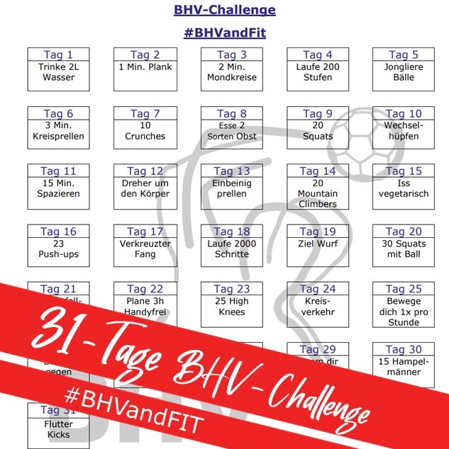 Aus diesem Grund hat sich der BHV unter dem #BHVandFIT eine kleine Challenge überlegt die sich an jeden im Verbandsgebiet richtet. Wir helfen euch sowohl physisch als auch mental stark zu werden oder zu bleiben. Hierfür wird jeden Tag ein Video oder Foto zu jeder Challenge veröffentlicht. Die Übungen sind in vier verschieden Kategorien unterteilt die abwechselnd vorkommen. Es gibt folgende Kategorien: Mentale Stärke, Sportübungen, Übungen mit Ball, Alltagsherausforderungen und Trickshots.