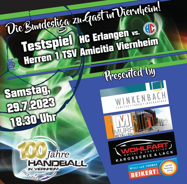 „Die Viernheimer Handballer feiern dieses Jahr ihr 100-jähriges Bestehen. Hier wartet am 29.07. auch ein sportliches Highlight auf die Handballfans in Viernheim und Umgebung. Die Mannschaft von Trainer Christian Müller trifft im Rahmen ihrer Saisonvorbereitung auf den Bundesligisten HC Erlangen, der sich seinerseits auf die kommende Bundesligasaison vorbereitet. Spielbeginn in der Viernheimer Waldsporthalle ist um 18:30h.