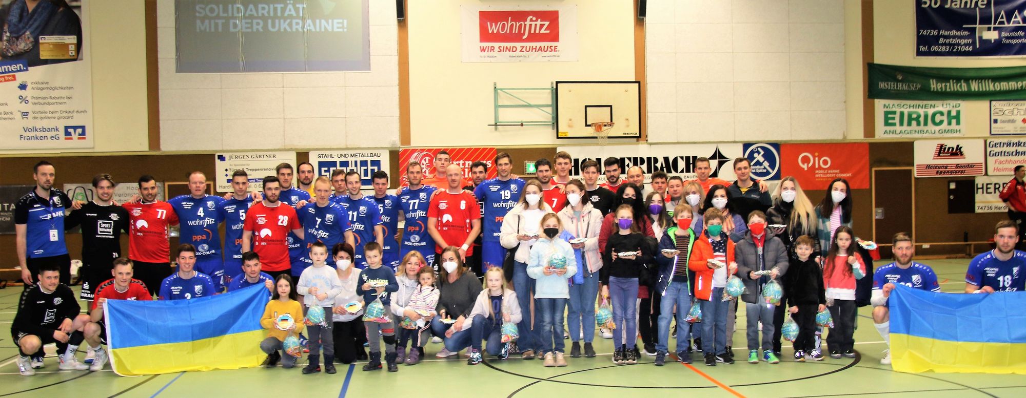 Hardheim. (kn) Auf Initiative der Handballer um Organisator Lukas Dyszy sind neun Frauen und vierzehn Kindern aus der Ukraine der Einladung des TVH gefolgt, um beim Handballspiel für zwei Stunden Ablenkung aus ihrem schweren Alltag zu finden. Unter großem Beifall der Zuschauer wurden die Gäste die in Hardheim eine vorrübergehende Bleibe gefunden haben vor dem Spiel willkommen geheißen.