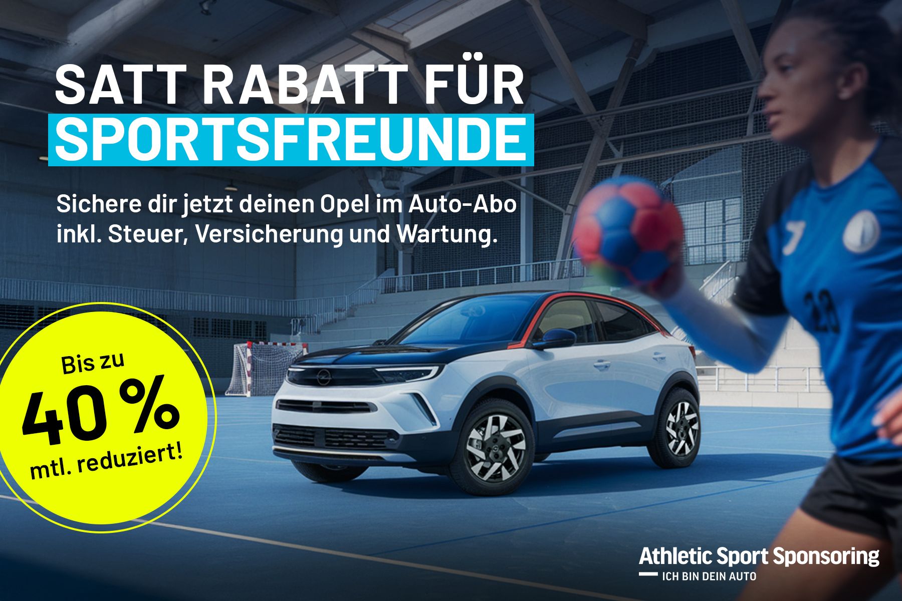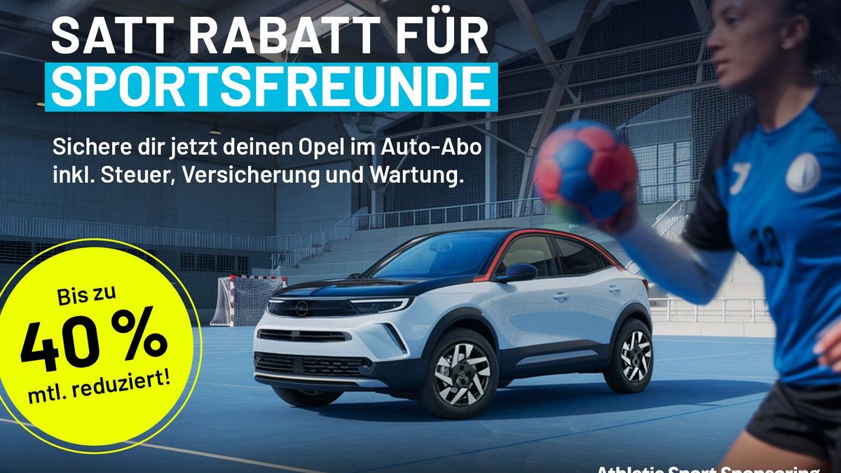 Unser Partner Athletic Sport Sponsoring macht es euch jetzt noch einfacher, unschlagbar preisbewusst im Rundum-sorglos-Paket unterwegs zu sein. Sichert euch jetzt ausgewählte Opel-Modelle zum extragünstigen Preis im Auto-Abo!